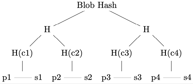 A Merkle tree over the sliver hashes is then computed to obtain a blob hash. This is computed by concatenating primary and secondary sliver hashes for each sliver pair, and then constructing the Merkle tree over the concatenations ( in the figure). This construction reduces the number of hashing operations compared to hashing each sliver Merkle root individually.