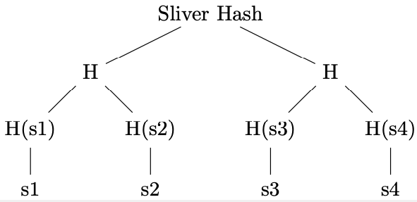 The tree is constructed over all symbols of the fully expanded sliver. The root node of the Merkle tree (the sliver hash) is included in the metadata for the blob. To prove that a symbol is part of a sliver, the prover supplies the symbol alongside the Merkle path to the root hash, which every node has as part of the metadata.